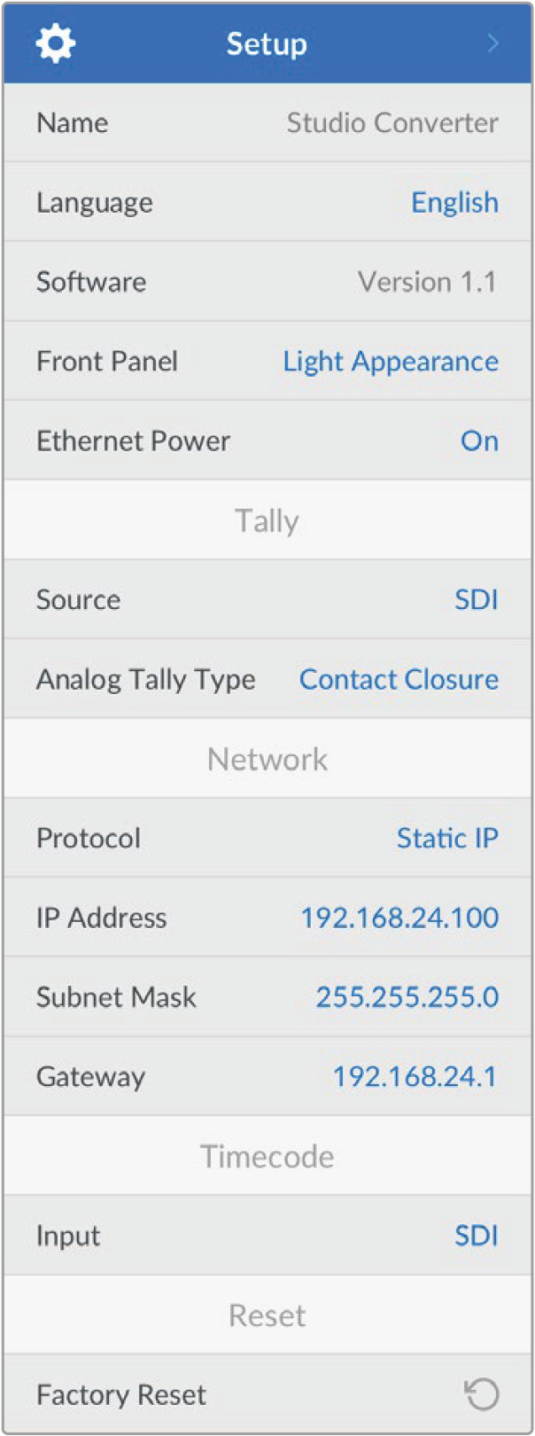 ‘Factory reset’ restores your Blackmagic Studio Converter to its factory default settings. Press ‘set’ and confirm the setting when prompted.