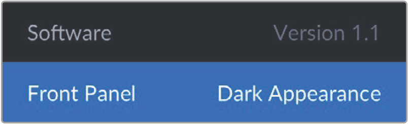 Set your Blackmagic Studio Converter’s front panel to ‘light’ mode for a brightly illuminated LCD. Use ‘dark’ mode for dimly lit environments where a bright LCD may be distracting, for example multiple studio converter units mounted in a rack in a production facility.