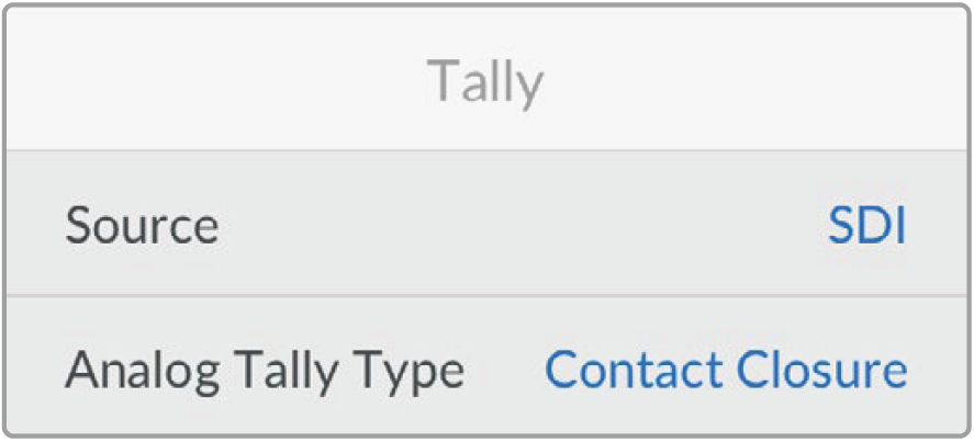 Select SDI for embedded tally from an ATEM switcher, or ‘analog’ for third party tally systems connected via the DE-9 serial connector.