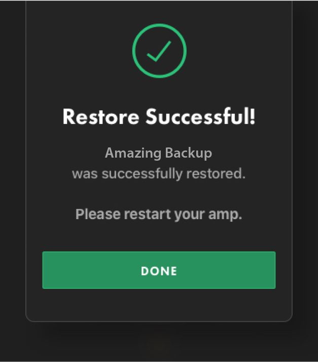After selecting “RESTORE” from both warning prompts, the “RESTORE IN PROGRESS” and “RESTORE SUCCESSFUL” screens appear; the user selects “DONE” and then restarts the amplifier: