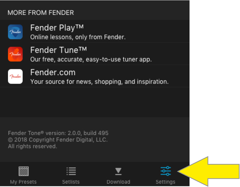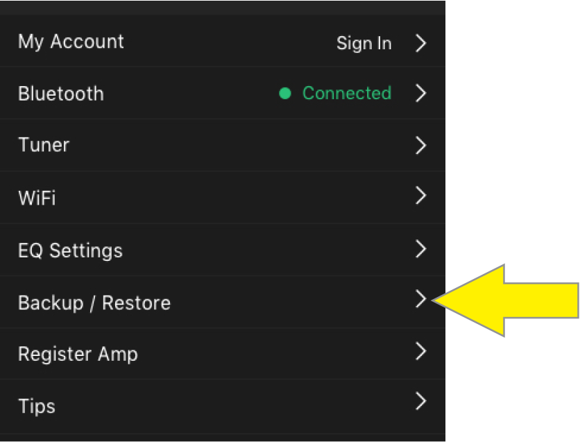 To restore or delete presets and Setlists from the cloud, first connect to Fender Tone and open the app. In the app, go to the “SETTINGS” menu and press “BACKUP/RESTORE”: