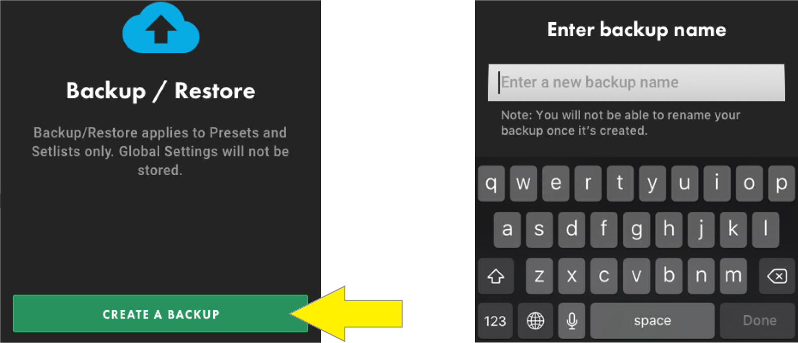 The first time a backup is created, the user is prompted to select “CREATE A BACKUP”, then to enter a backup name: