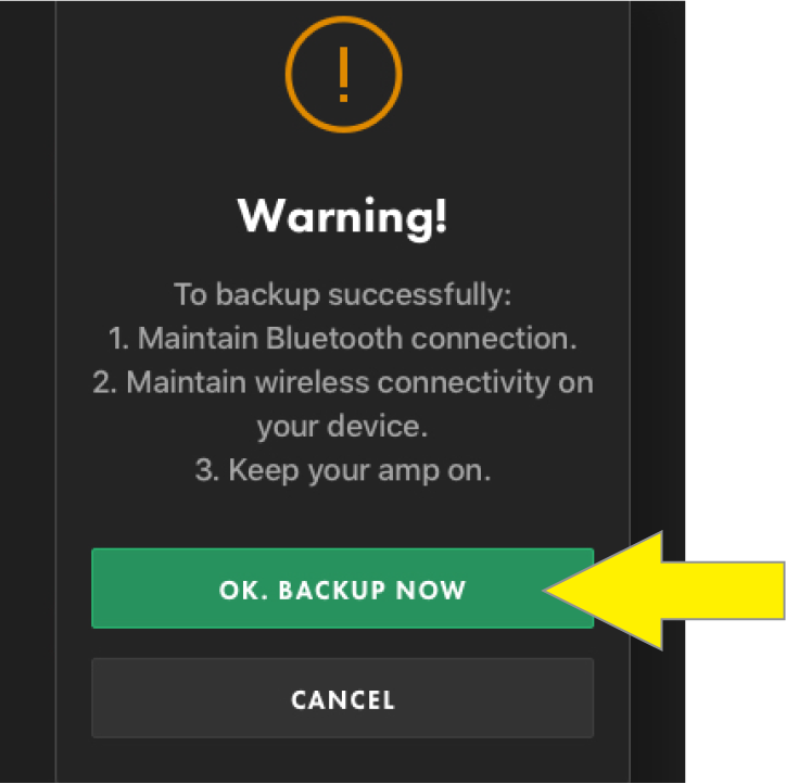 After a backup name is entered, a warning screen prompts the user select “OK BACKUP NOW” or “CANCEL”: