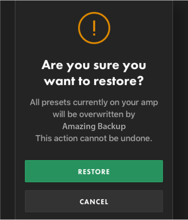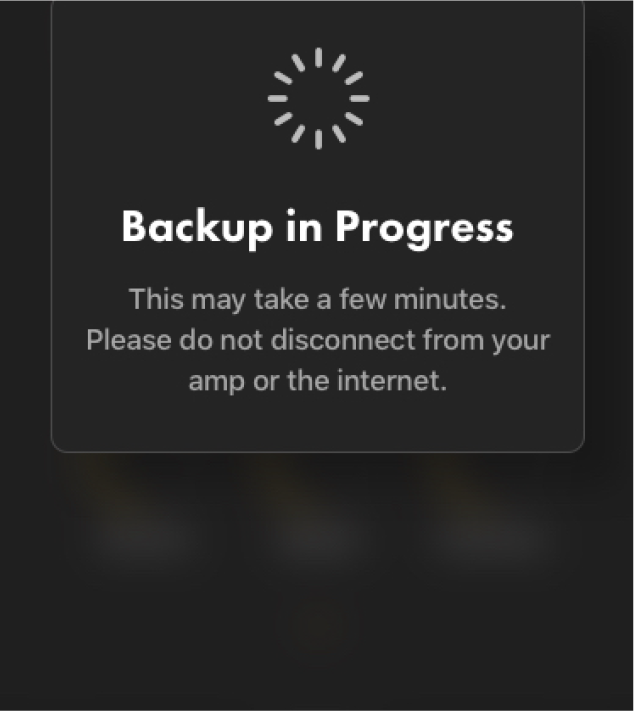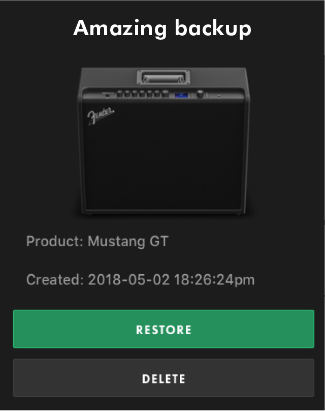 Mustang GTX has cloud-based backup and restore features for presets and Setlists, both using the Fender Tone™ app. A Fender Connect account is necessary to use these features (Fender Connect accounts can be created on the Fender website at fender.com by clicking “Sign In” at top right of the screen, or from the Tone app by tapping “My Account” in the settings screen).