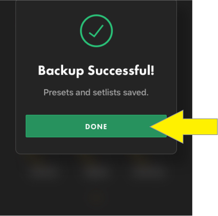 After selecting “OK BACKUP NOW”, the “BACKUP IN PROGRESS” and “BACKUP SUCCESSFUL” screens appear, indicating that all presets and Setlists are now backed up. The user then selects “DONE”: