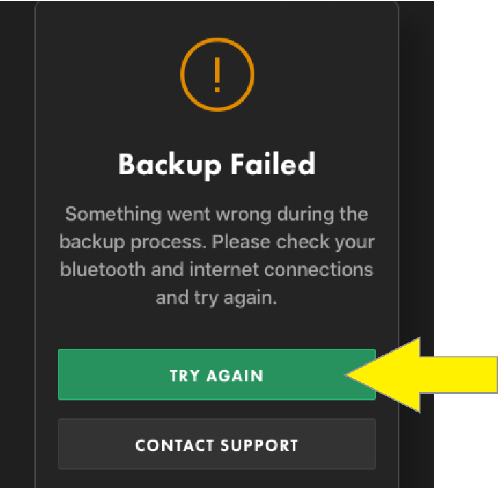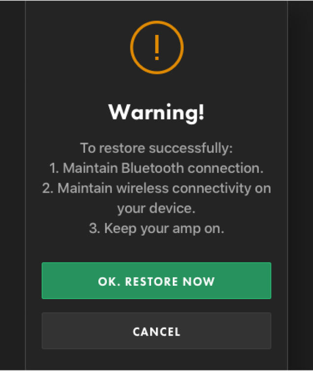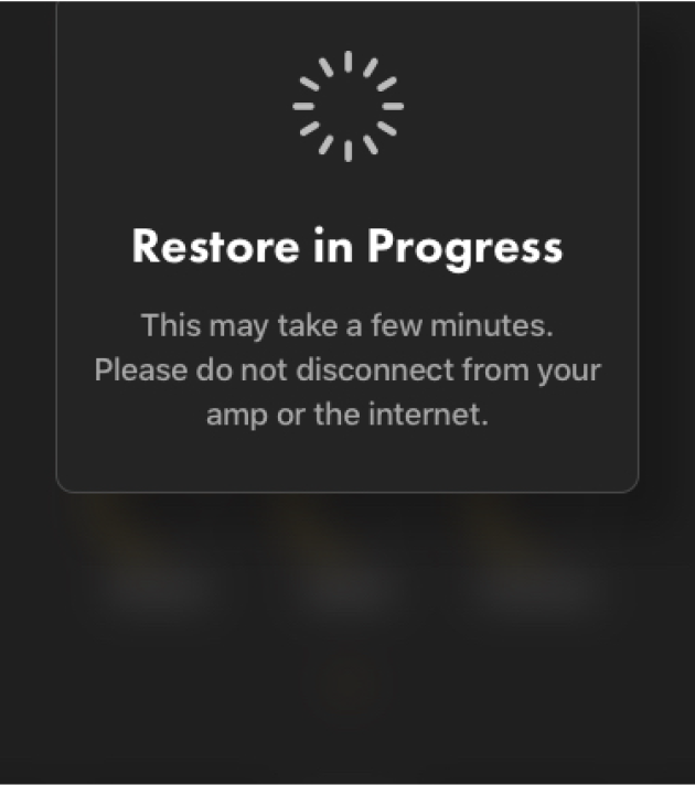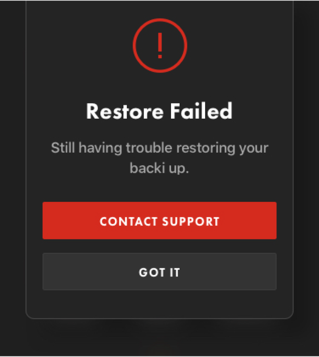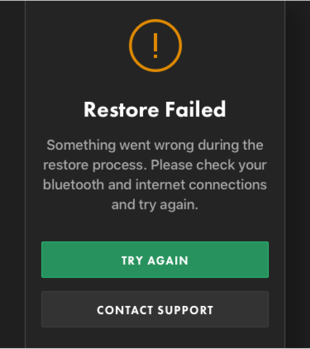 Alternately, a “RESTORE FAILED” screen may appear, prompting the user to select “TRY AGAIN” or “CONTACT SUPPORT” (the latter directs the user to the Tone app support portal on the Fender website). If the restore fails again after selecting “TRY AGAIN”, a second “RESTORE FAILED” screen then prompts the user to select “CONTACT SUPPORT” or “GOT IT”, which returns the user to the “BACKUP/RESTORE” screen: