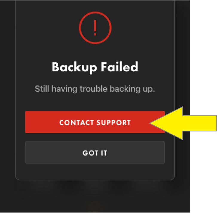 Alternately, a “BACKUP FAILED” screen may appear, after which the user selects “TRY AGAIN” or “CONTACT SUPPORT” (the latter directs the user to the Tone app support portal on the Fender website). If the backup fails again after selecting “TRY AGAIN”, a second “BACKUP FAILED” screen then prompts the user to select “CONTACT SUPPORT”, which directs the user to the Tone app support portal on the Fender website, or to select “GOT IT”, which returns the user to the “BACKUP/RESTORE” screen: