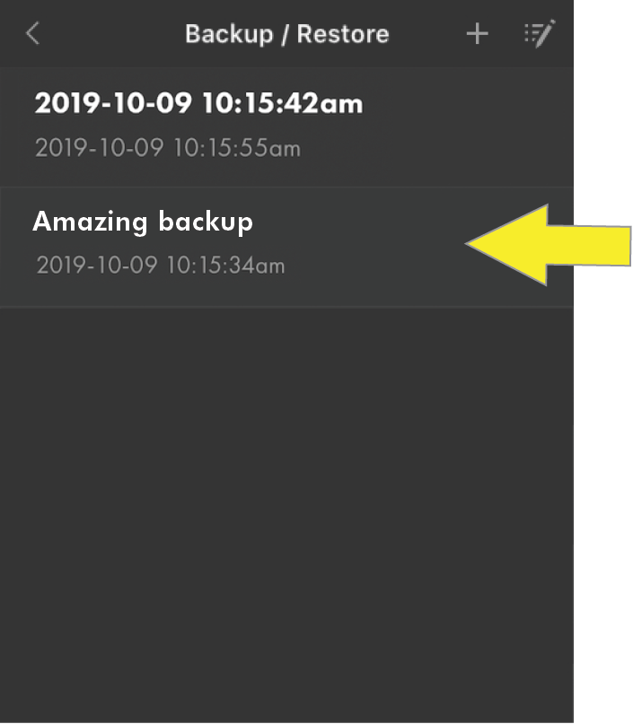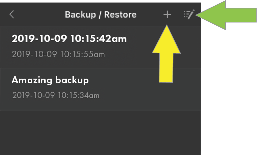 Backups are logged by time and date in the cloud; this backup log can be viewed in the Fender Tone app. By selecting the “edit” symbol at upper right (green arrow), a backup can be deleted; note that doing so deletes the backup from the cloud, not merely from the backup log. Also note that when creating subsequent backups after the first one, the “CREATE A BACKUP” button is replaced by a plus symbol at upper right (yellow arrow):