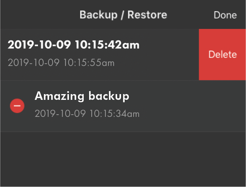 A list of the backups already created will appear; select the one to be restored from the list. A screen detailing the backup will then appear; select “RESTORE” or “DELETE”: