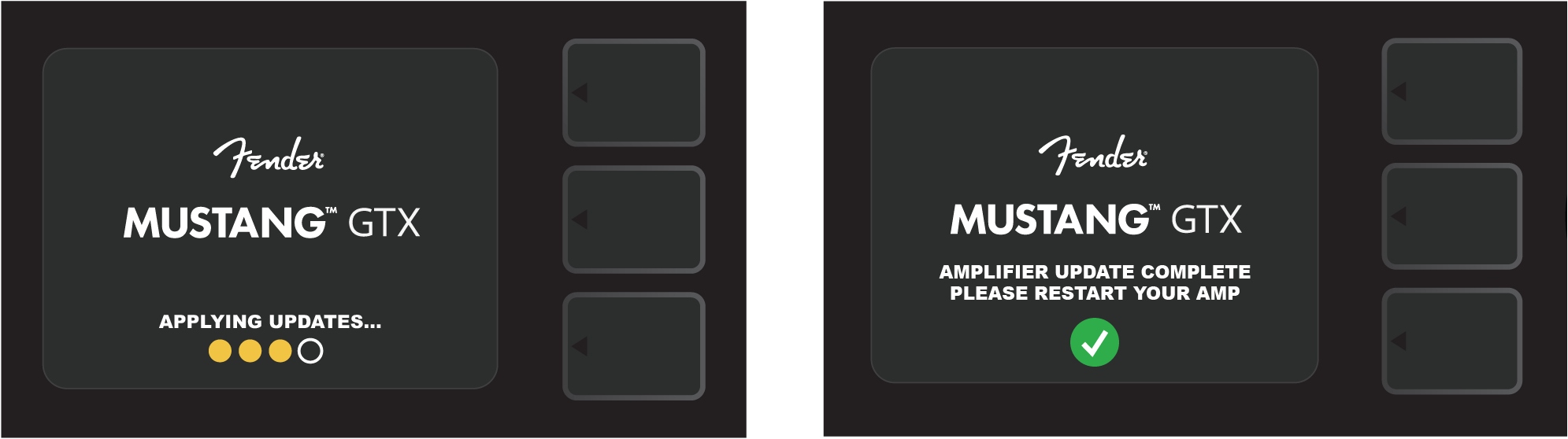 When the download is complete, the DISPLAY WINDOW will then indicate that Mustang GTX is applying the firmware update, followed by indication that the firmware update is complete and the amp should be restarted (see illustrations below).