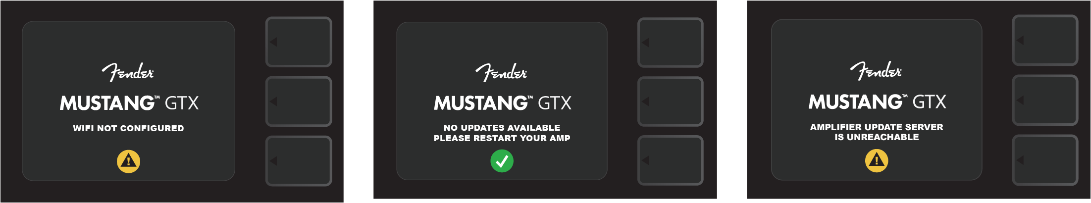 When performing a firmware update, the user might encounter three scenarios in which a firmware update cannot be initiated. In such cases, the DISPLAY WINDOW will indicate that Mustang GTX’s WiFi connectivity is not configured, no update is available, or the amplifier update server is unreachable (see illustrations below).