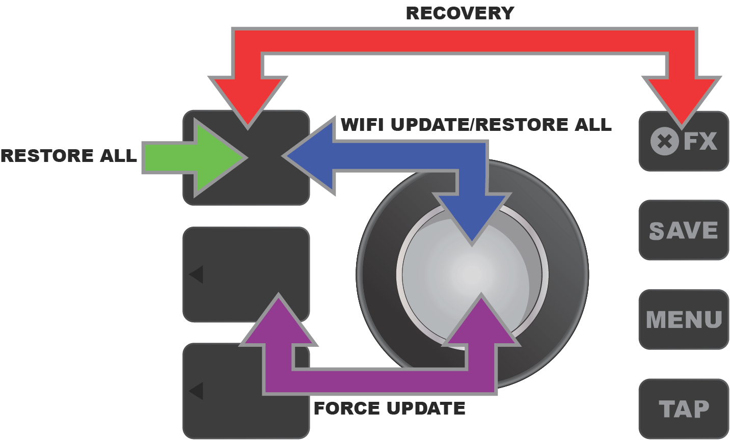 FORCE UPDATE: To update Mustang GTX if there is a problem with the previously described firmware update process, a “Force Update” mode can be initiated by pressing and holding the ENCODER and SIGNAL PATH LAYER button while turning the amplifier on (purple arrow in illustration below).