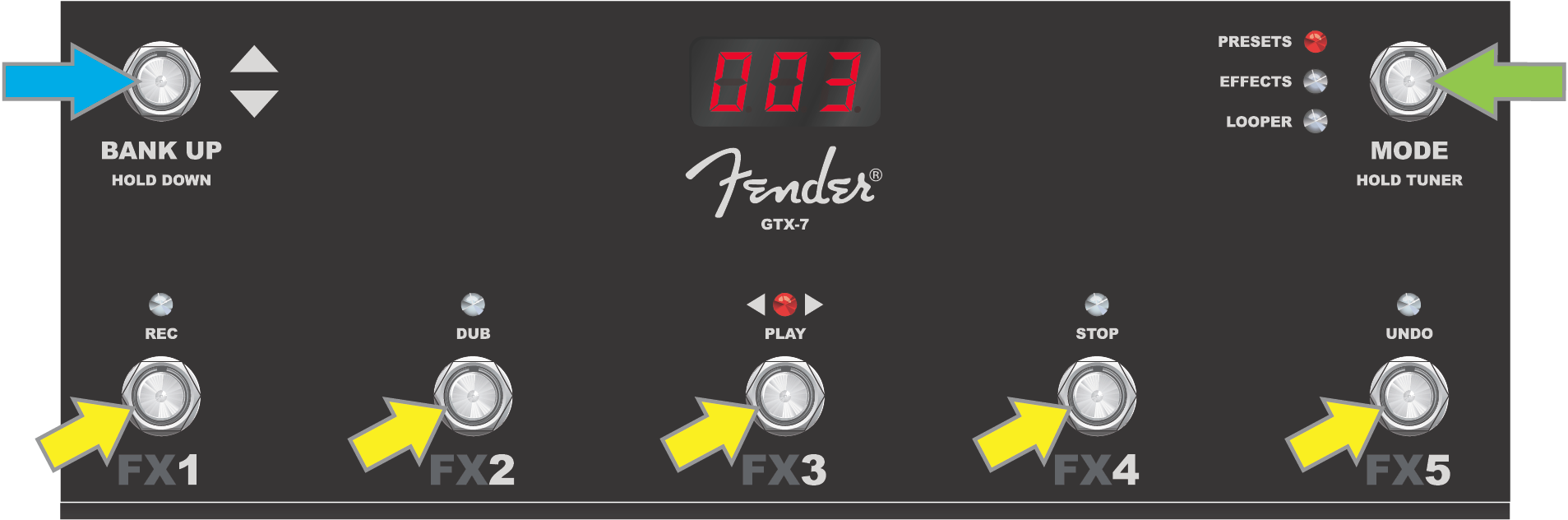 When the GTX-7 Footswitch is in PRESETS mode, presets become available in consecutive groups of five called “banks,” with each of the five presets in a bank sequentially assigned to FUNCTION buttons 1, 2, 3, 4 and 5. To move “upward” through subsequent banks of five presets, step on the BANK UP button (blue arrow in illustration below). To move “downward” to the preceding bank of five presets, step on and hold the BANK UP button.