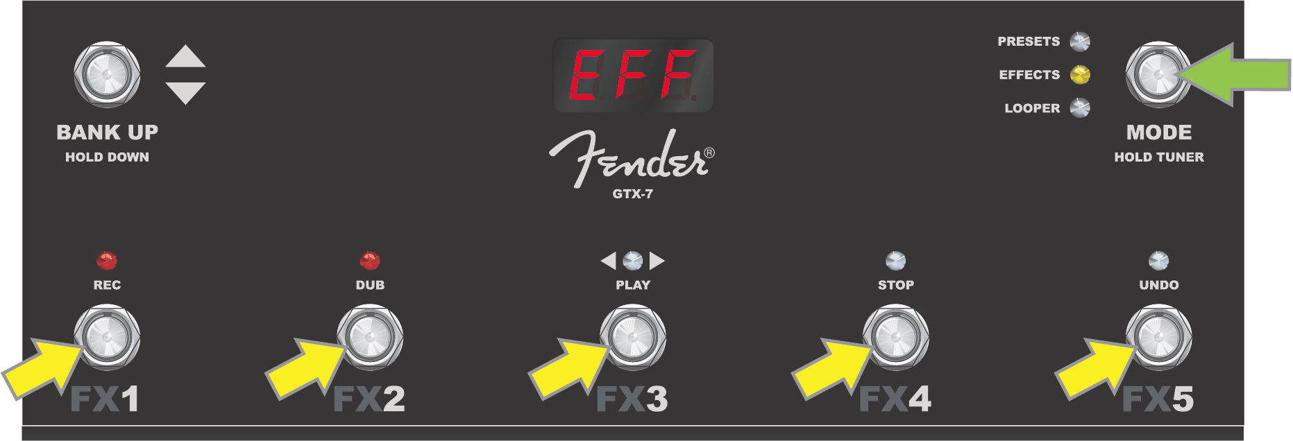 To do this, step on the footswitch MODE button (green arrow in illustration on next page) until EFFECTS mode is activated; the MODE LED directly to the right of the label “EFFECTS” will illuminate in amber and “EFF” will appear in the DISPLAY WINDOW (see illustration on next page). Any effects in the active preset are then assigned to the footswitch FUNCTION buttons—labeled “FX1”, “FX2”, “FX3”, “FX4” and “FX5” for this purpose (yellow arrows in illustration below). When an effect is on, the red FUNCTION LED above its assigned FUNCTION button will illuminate. To bypass an effect, step on its corresponding FUNCTION button; theeffect and its red FUNCTION LED will then turn off. To turn the effect back on, step on its FUNCTION button again.