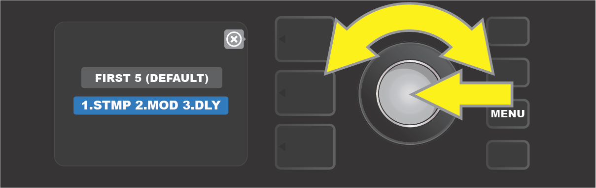 Use the ENCODER to scroll to and select the “category” setting, shown in the DISPLAY WINDOW as “1.STMP 2.MOD 3.DLY”, then press the MENU utility button to return to the active preset: