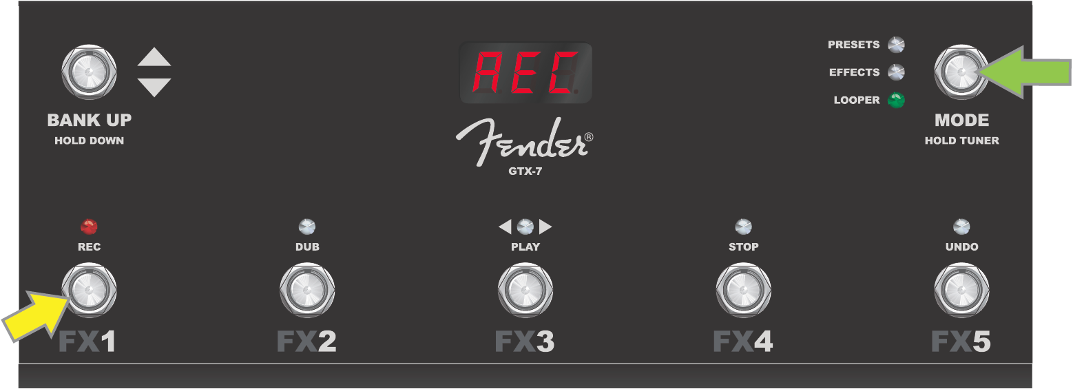 LOOPER mode enables the user to record loops up to 60 seconds long and overdub subsequent parts. Any number of overdubbed parts can be layered over the original recorded part; however, only the last overdub created can be undone. To record a loop, step on the MODE button (green arrow in illustration below) until “LOOPER” mode is activated; the MODE LED directly to the right of the label “LOOPER” will illuminate in green (see illustration below).