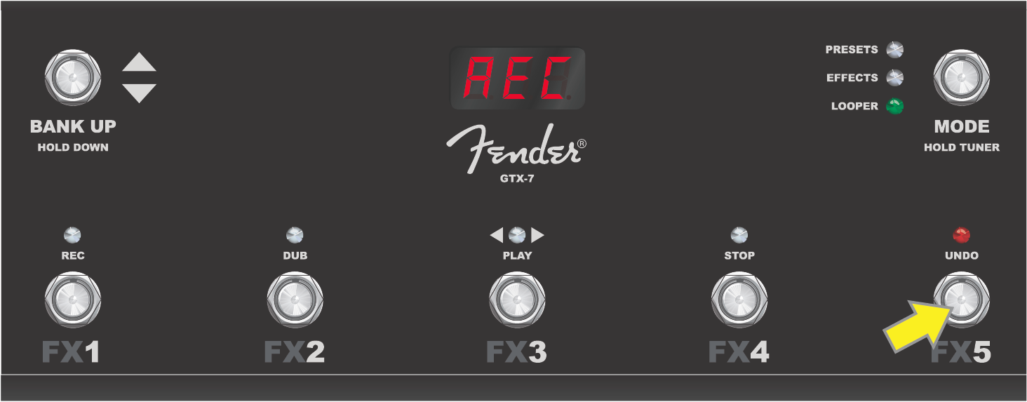 While recording, playing back or stopped on the first musical passage, the user can undo the recording if desired by stepping on FUNCTION button 5 (yellow arrow in illustration below), labeled “UNDO.” When doing so, recording will stop, the red FUNCTION LED above the button will illuminate and the DISPLAY WINDOW will show the mode is currently in use (“REC” in the illustration below). Once overdubs have been added, however, the UNDO function applies only to the last overdub recorded; preceding overdubs cannot be undone.