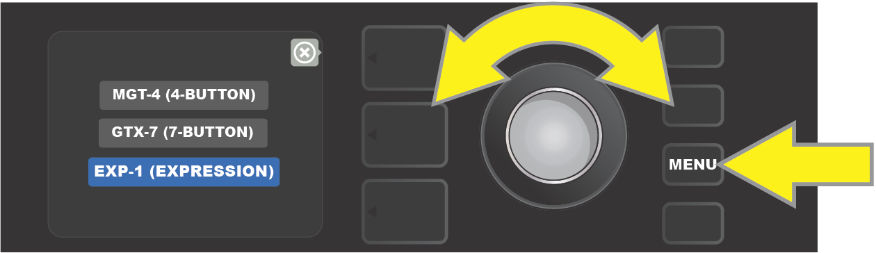 To set up the EXP-1 for use, connect it to the footswitch jack on the back of the amplifier, turn the amp on. Press the MENU utility button on the amp and use the ENCODER to scroll to and select “FOOTSWITCH” (not shown), and then “EXP-1(EXPRESSION)” on the menu shown (see illustration below).
