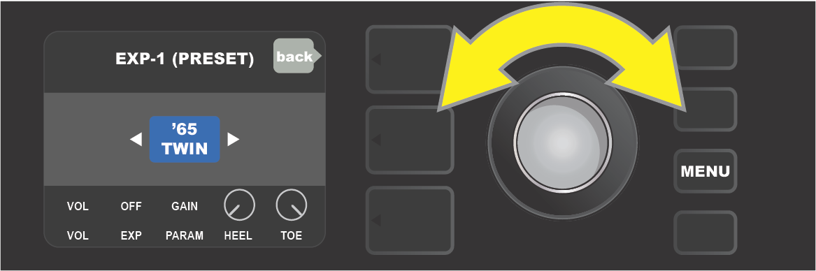 Press the ENCODER and turn it to select “PEDAL” or “PRESET.” The label box will change from blue to red (see illustration below) until a selection is made by pressing the pressing the ENCODER AGAIN, after which the label box will return to blue with the current selection in place.