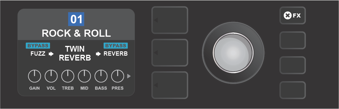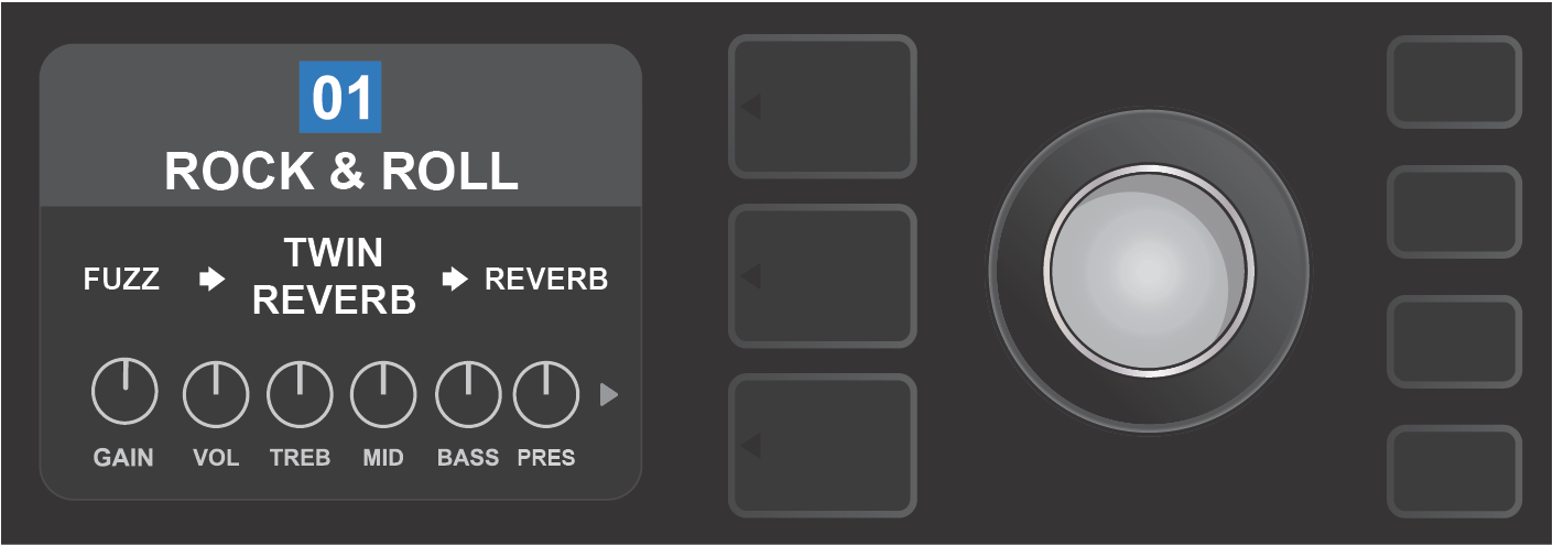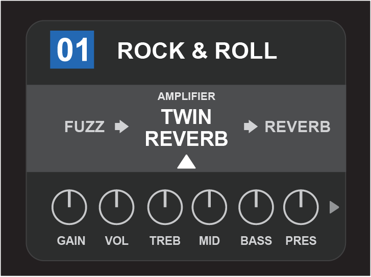 Within each preset, the amplifier control knob settings, amp models, and effects types and parameters can be tailored to individual preference. When a preset is selected, the box containing its number is blue, indicating that no edits have been made to it (see illustration below).