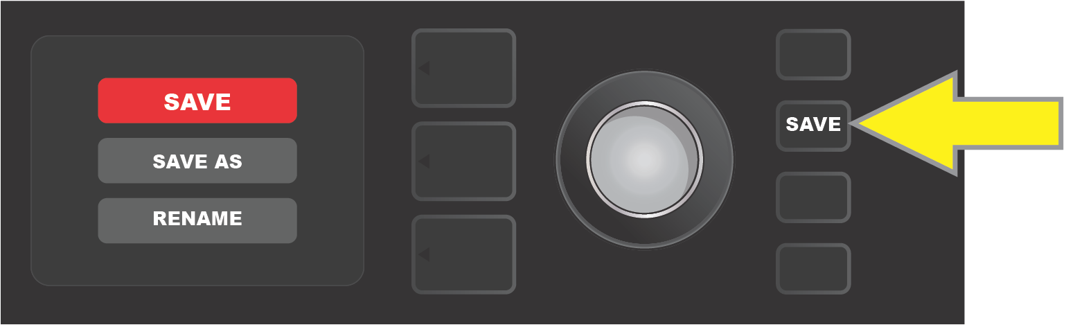 If an edited setting is not saved, the preset will revert to its previous settings when returning to the preset after leaving it, or when turning the amplifier off and back on again. To save a preset edit, press the illuminated SAVE utility button to get three options (see illustration below): SAVE (keep preset as edited), RENAME (save preset with a new name in its current position) and SAVE AS NEW (save preset in a new position with a new name). Turn the ENCODER to highlight an option; press it to select one.