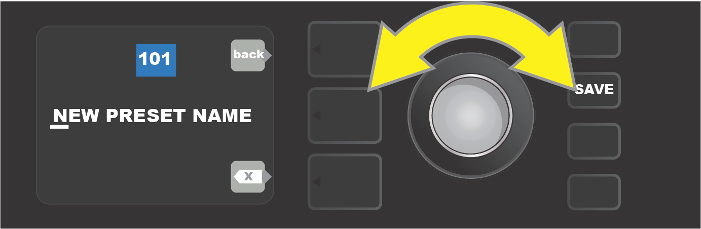 To enter a new preset name after choosing RENAME or SAVE AS NEW, use the ENCODER to spell out a new name of your choice. Press the ENCODER once to activate the cursor; turn it to choose a character (see illustration below). Press ENCODER again to enter that character and move to the next. Repeat until new name is complete; press the SAVE utility button to keep completed new name, or press the top LAYER button (corresponding with onscreen prompt “back”) to return to the previous screen. Note that when choosing SAVE AS NEW, the preset will be saved in the next available open position (“101” in the illustration below).