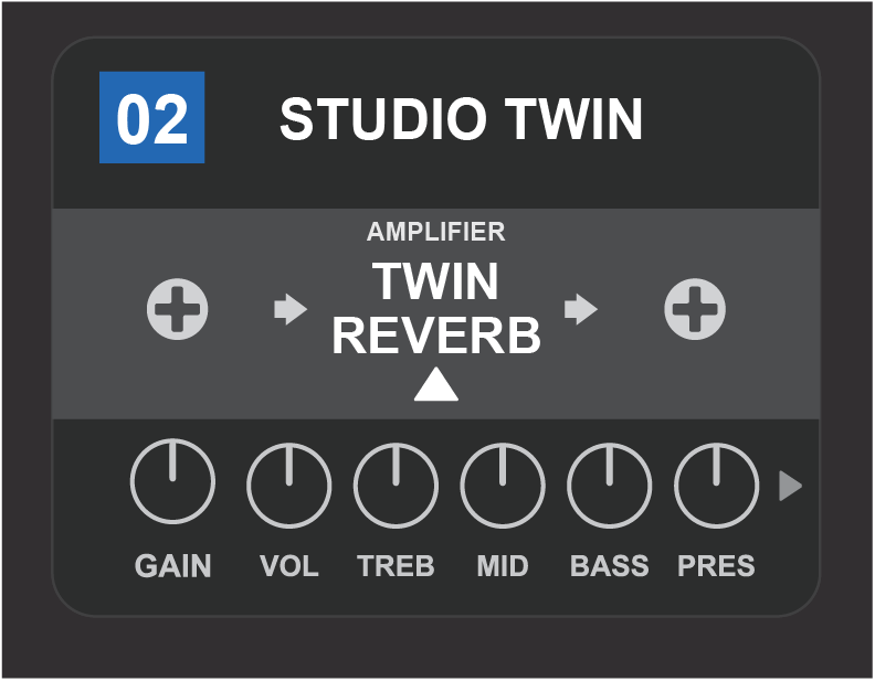Flanked by two effects, the amp model within the preset is selected here in the SIGNAL PATH LAYER, as indicated by the white arrow and the word “amplifier.”