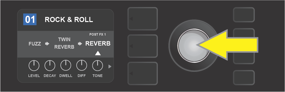 The SIGNAL PATH LAYER of each preset consists of one of Mustang GTX’s many amplifier models, and one or more of dozens of effects and their order (or no effects in some cases). The amp model appears in the center of the SIGNAL PATH LAYER display. Effects appear to either side of the amp model, representing their position in the signal path—“pre” to the left of the amp model (placed “before” the amp) or “post” to the right of the amp model (as in an effects loop). Select any of these items by turning the ENCODER; the selected item in the SIGNAL PATH LAYER will have a white indicator arrow below it and text describing its position above it (see illustration below).