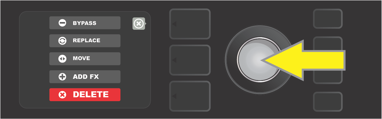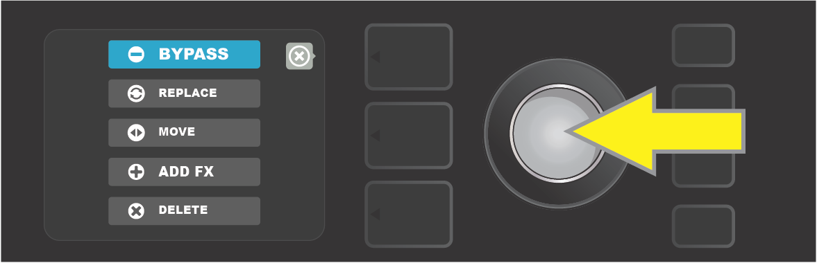 To replace preset amp model highlighted in the SIGNAL PATH LAYER (as indicated here by the white arrow below it and the label “amplifier” above it) with a different amp model, first press ENCODER to access a menu of other amp models.