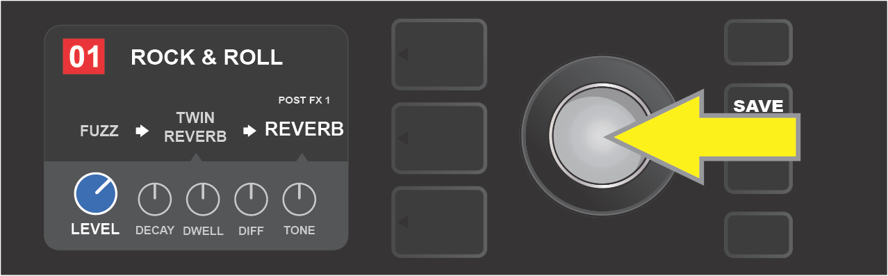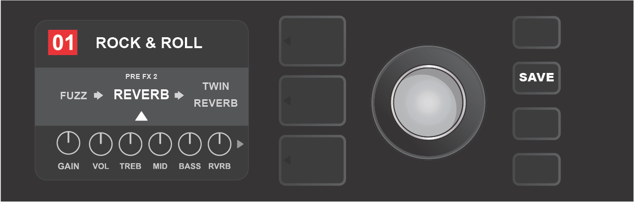 Once in the CONTROLS LAYER, turn and press the ENCODER to scroll through and select a specific digital amp control knob. Then turn the ENCODER again to change that control’s setting. When a control setting is changed, the box containing the preset number changes from blue to red (indicating that a preset edit has been made), and the SAVE utility button illuminates. With the new control setting in place, further edits can then be made or the SAVE utility button can be pressed to keep completed edits (see illustrations below).