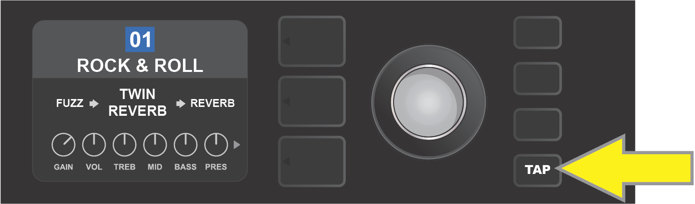 To change the tempo of the first delay effect (or modulation effect if no delay effect is present), tap the TAP utility button at the desired tempo.