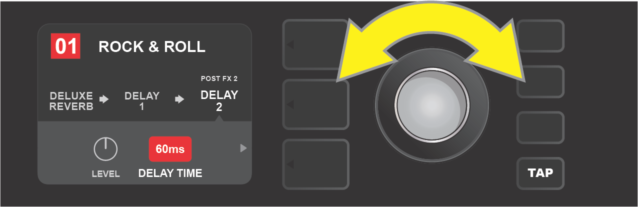 Various time parameters for all delay and modulation effects in the signal path can be adjusted in the CONTROLS LAYER without use of the TAP utility button. In the SIGNAL PATH LAYER, use the ENCODER to highlight the delay or modulation effect to be modified; its controls will then appear in the CONTROLS LAYER. Enter the CONTROLS LAYER by pressing its corresponding layer button, and scroll to the time parameter to be changed using the ENCODER. Press and turn the ENCODER to select and adjust the desired time value, during which the window containing the time value will turn red; press the ENCODER again to keep the new time value (see illustration below).