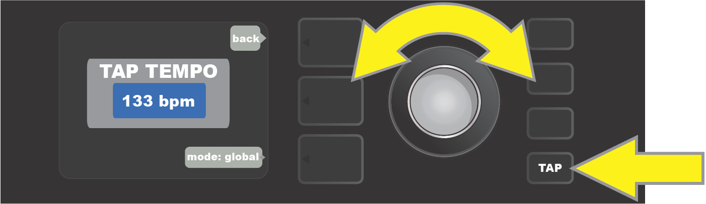 There are two modes for BPM—”global” and “preset”. “Global” mode applies a single BPM to all presets. In “preset” mode, each preset has its own BPM, which can be set individually per preset (the default rate is 120 BPM). To switch from one BPM mode to the other, press the bottom LAYER BUTTON corresponding to “mode: preset” or “mode: global” in the DISPLAY WINDOW; turn the ENCODER to adjust the BPM rate: