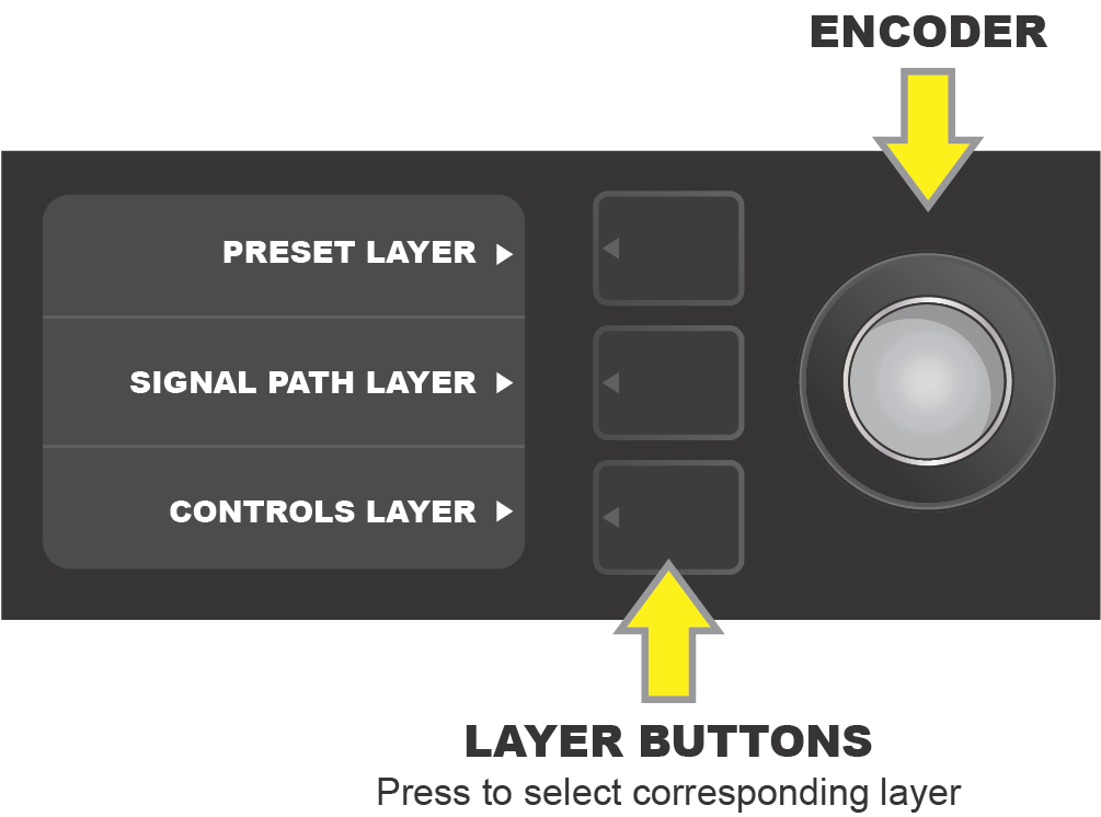 Scroll among, select and adjust additional CONTROLS LAYER amp and control settings using the ENCODER.