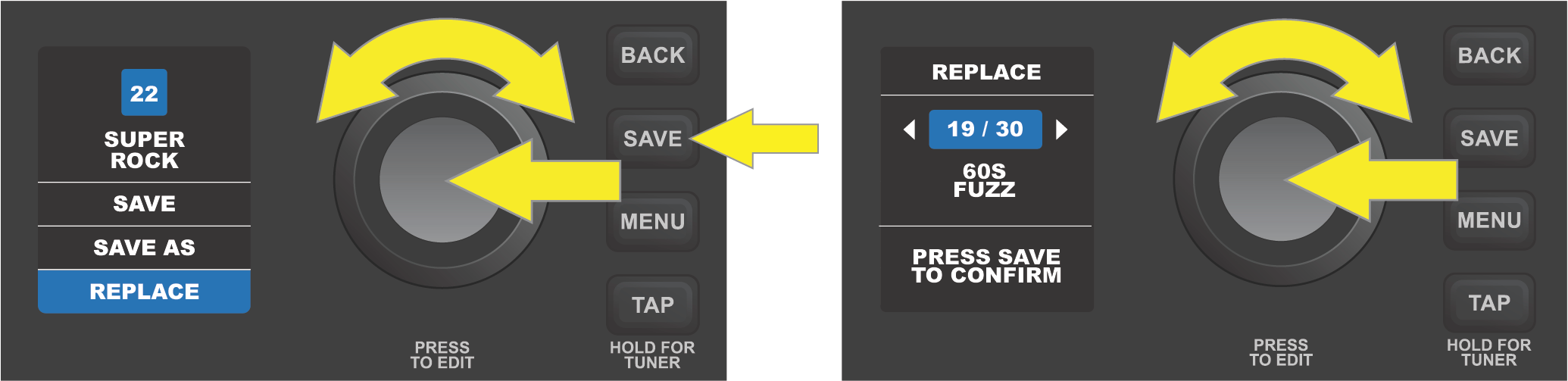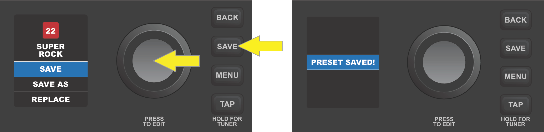 IMPORTANT: If edited amp control settings are not saved, the preset will revert to its original amp control settings when returning to the preset after leaving it, or when turning the amplifier off and back on again. To save edited amp control settings, press the SAVE utility button and use the ENCODER to scroll to one of three options—SAVE, SAVE AS or REPLACE. Each is detailed below.