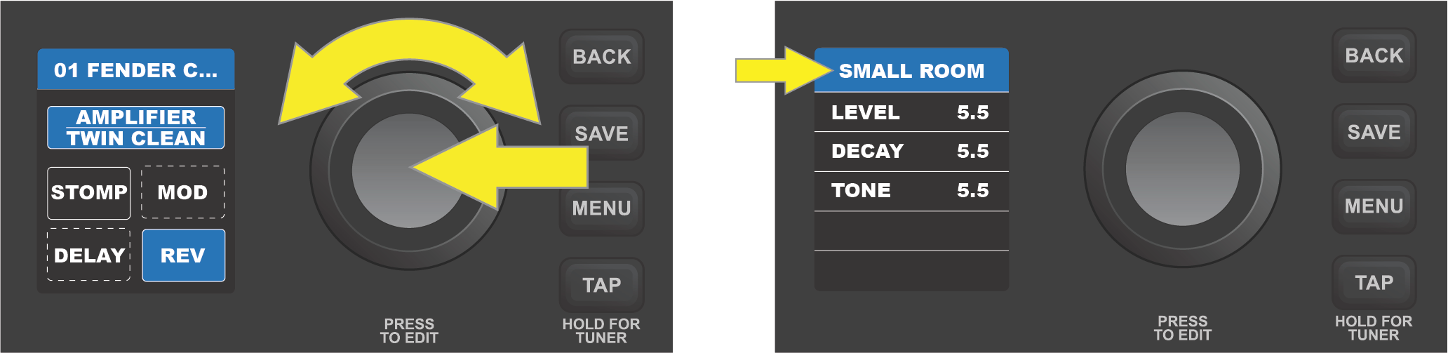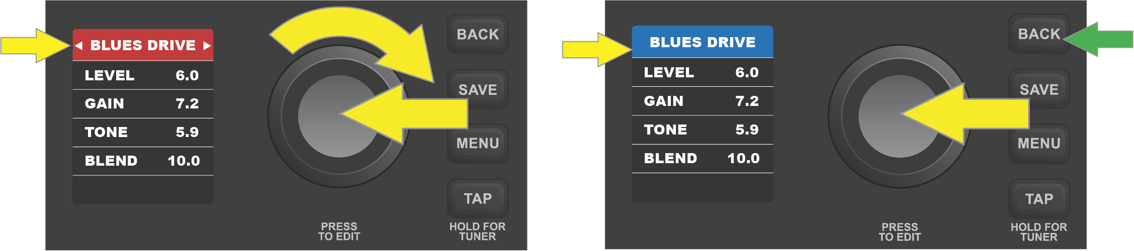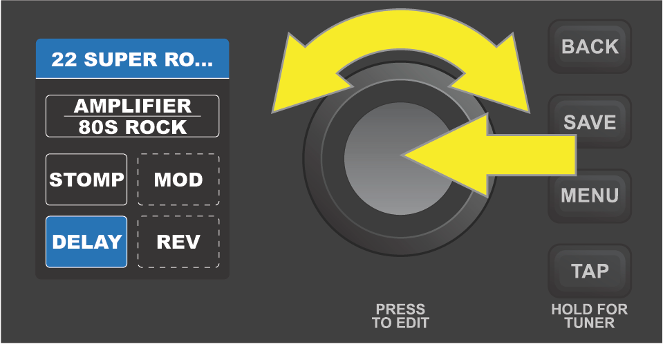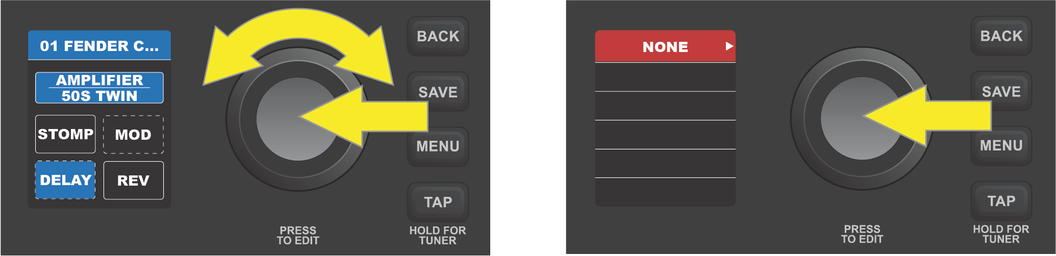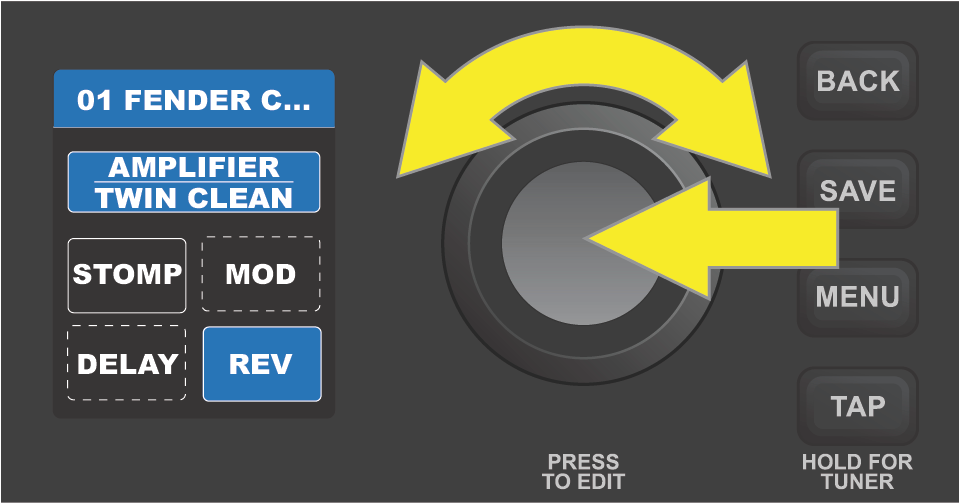 Select the amp model or one of the effects category boxes by turning and pressing the ENCODER. The active selection is then highlighted in blue: