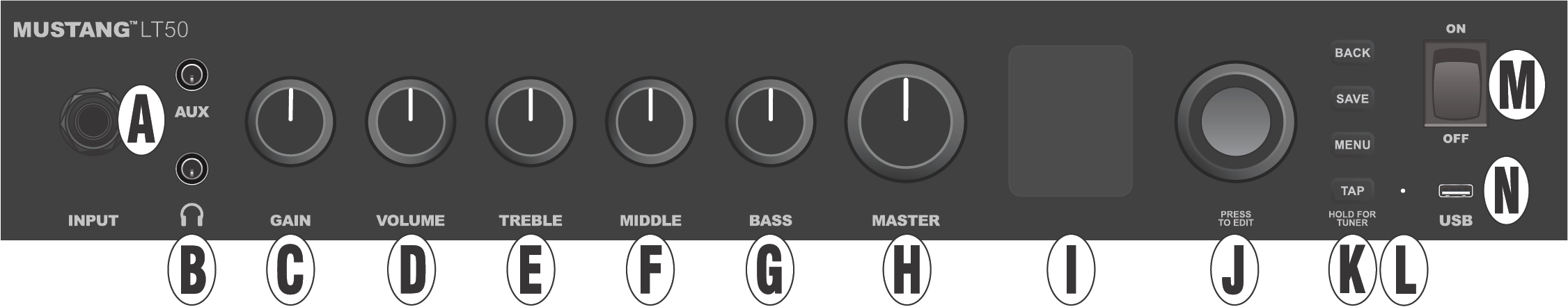 J. ENCODER: Rotary control with press-switch function. For viewing, selecting and adjusting Mustang LT50 presets, controls and other functions.