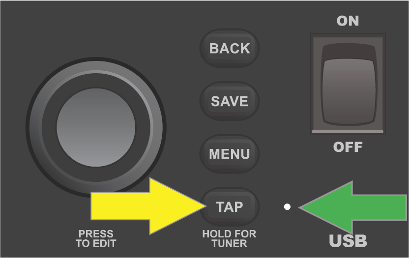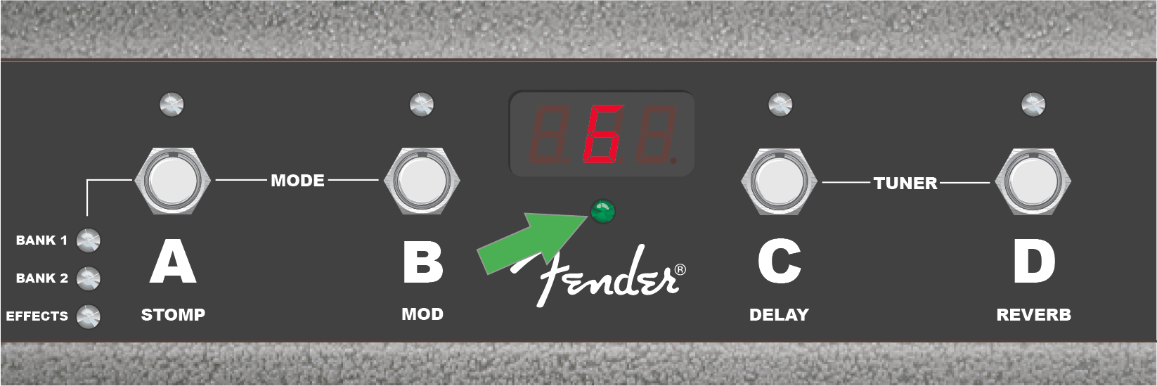 Here, the “G” note is at correct pitch, as indicated by the illumination of the green center LED (green arrow). When tuning is complete, step on any button to exit footswitch tuner mode.