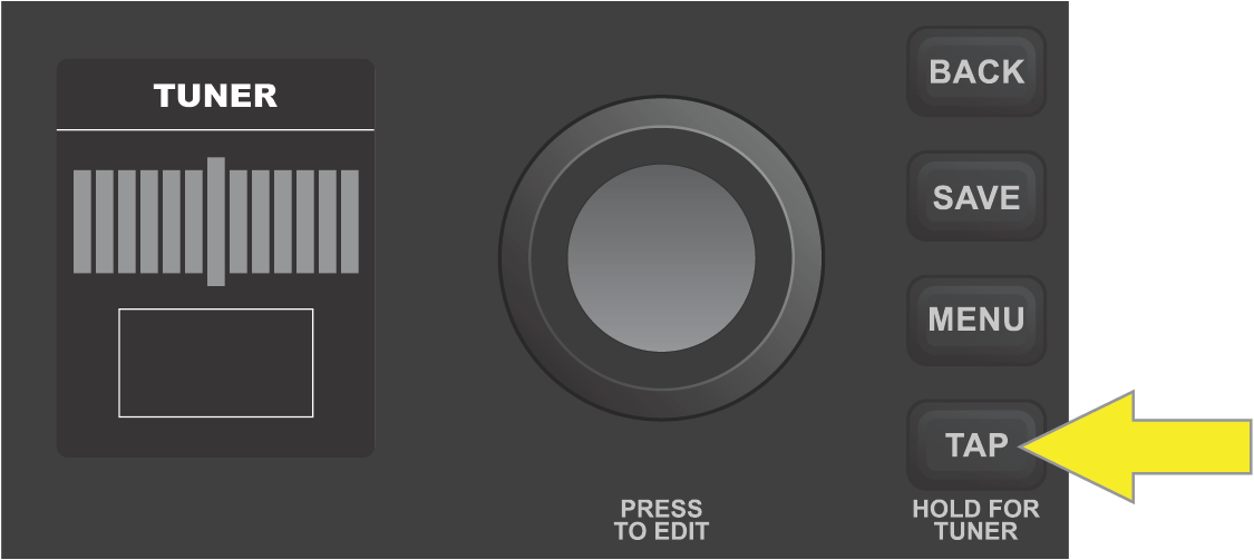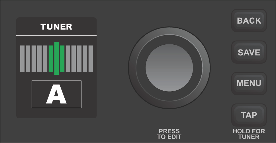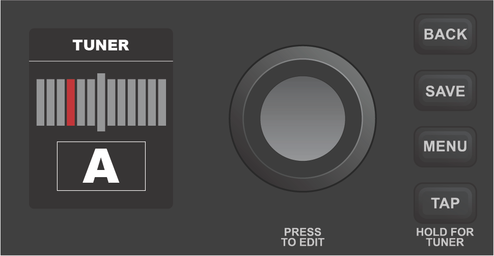 There are three ways to access Mustang LT50’s built-in chromatic tuner. The first way is to press and hold the TAP utility button on the control panel until the tuner screen appears in the DISPLAY WINDOW: