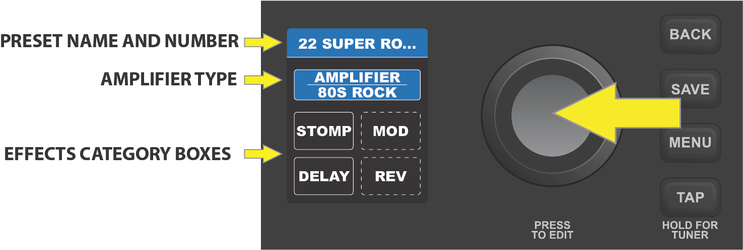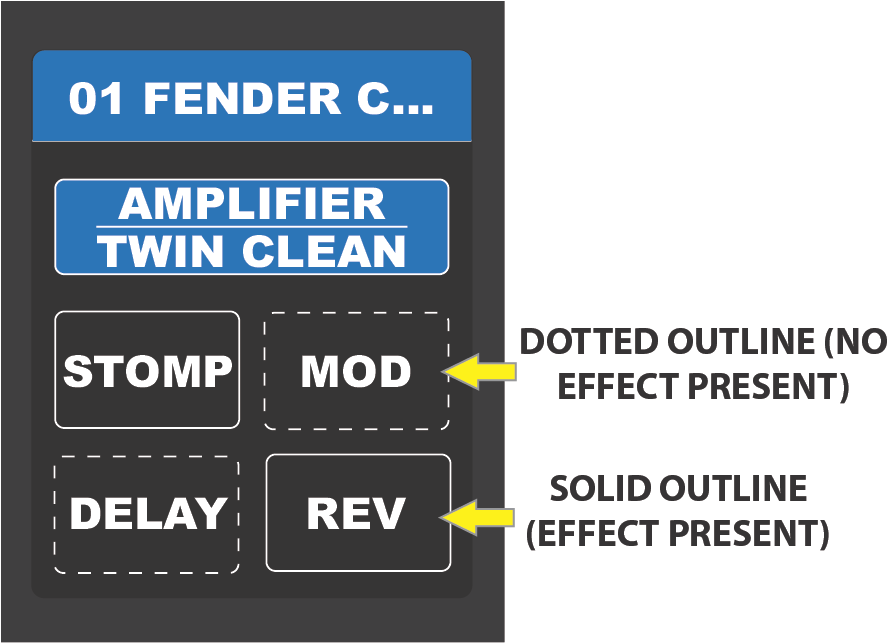 To access the contents of a preset, press the ENCODER. From the top down, the DISPLAY WINDOW will then show the number and name of the preset, the amplifier type in use, and four boxes that organize the effects used for that preset (if any). These effects category boxes are labeled STOMP (stompbox), MOD (modulation), DELAY and REV (reverb). When first accessing preset contents, the preset name and amplifier type are highlighted in blue:
