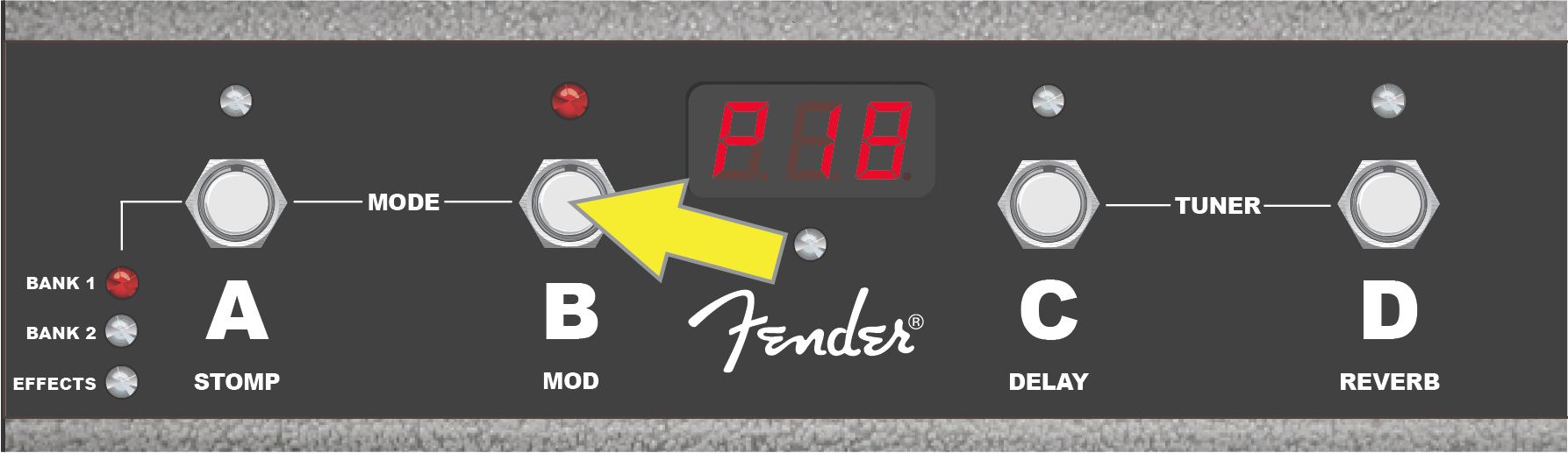 Simply step on the button corresponding to the desired preset. In the example here, preset 18 has been assigned to slot “B” in BANK 1 (as indicated by the illuminated red BANK 1 LED at far left, illuminated red LED above switch “B” and in the footswitch display window); step on footswitch button “B” to activate it (yellow arrow):