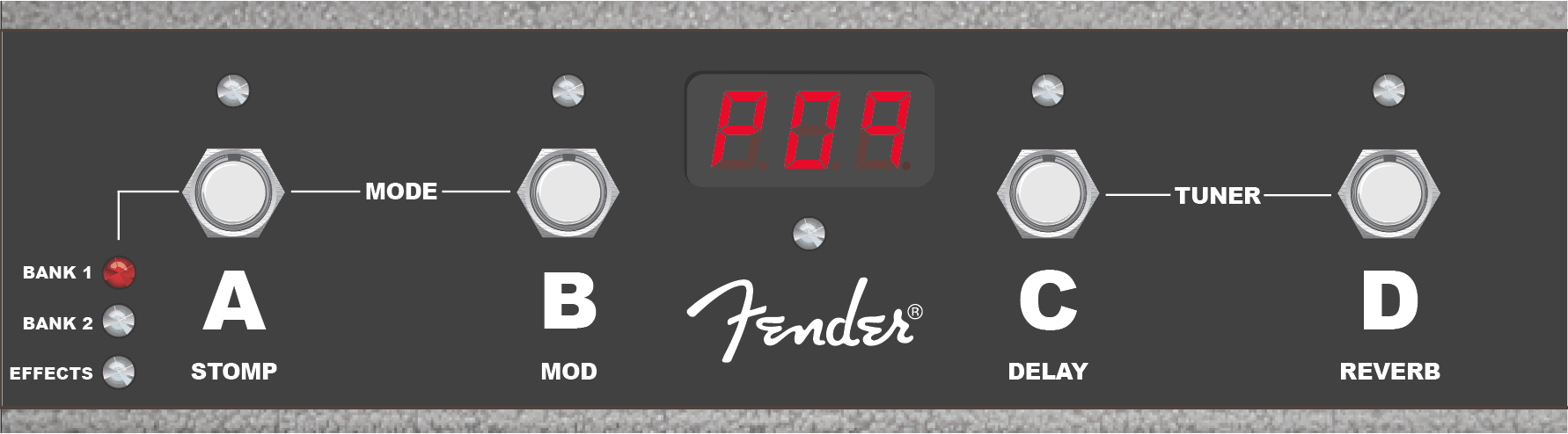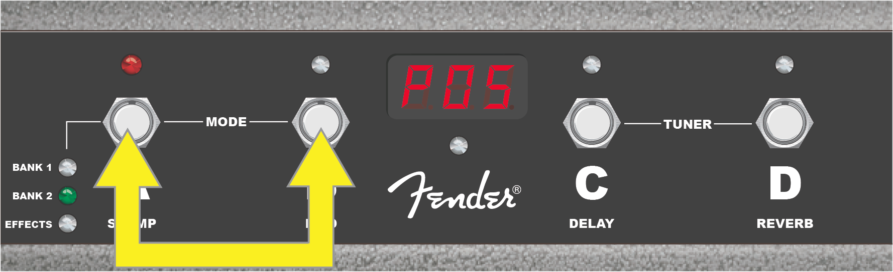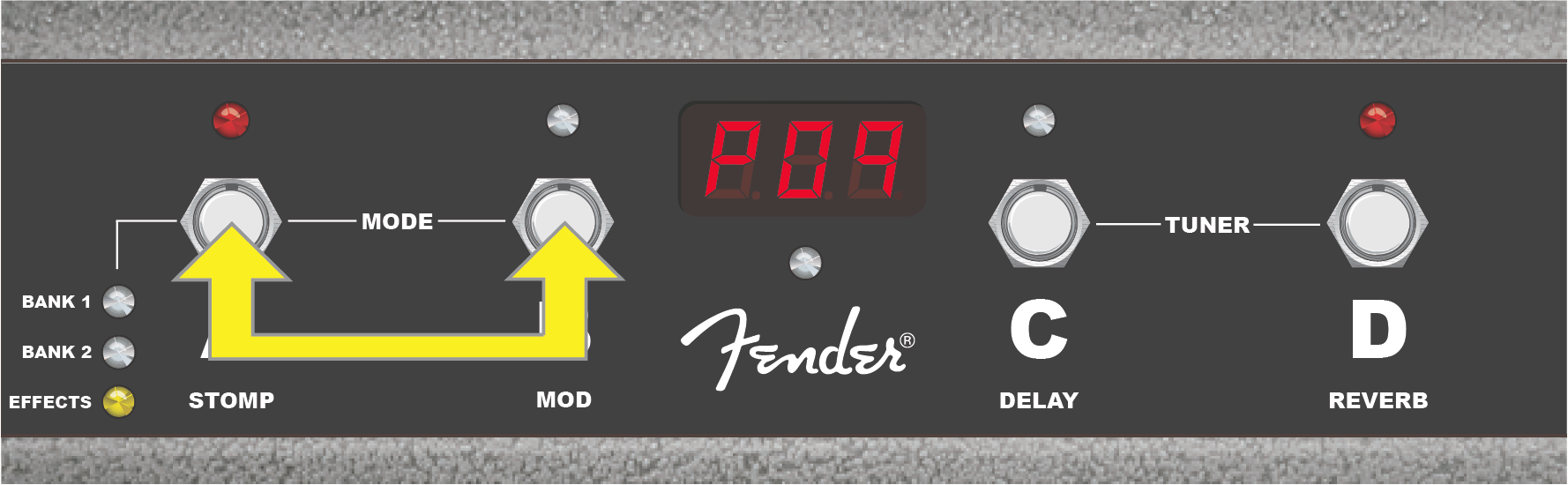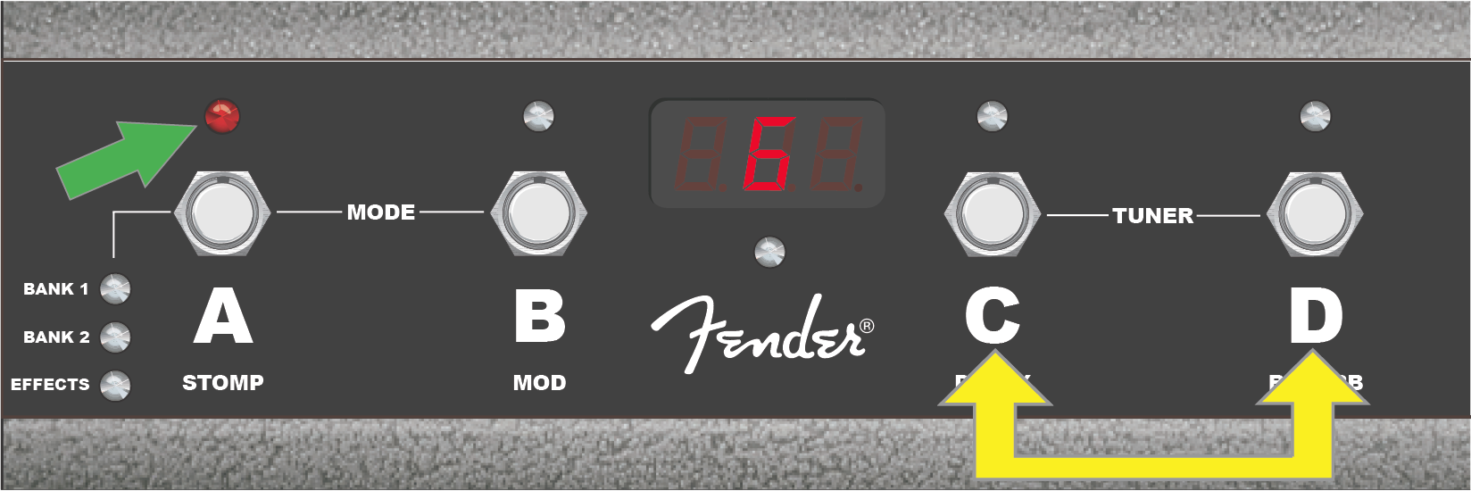 Effects in a preset (if any) can be turned on and off using the footswitch. To do this, step on buttons “A” and “B” simultaneously until the amber “EFFECTS” LED illuminates at far left (see illustration below). Footswitch buttons “A”, “B”, “C” and “D” are also respectively labeled as “STOMP” (A), “MOD” (B), “DELAY” (C) and “REVERB” (D). Since one effect only from each of these four categories can appear in a preset, any effects used in a preset are automatically assigned to the four footswitch buttons.
