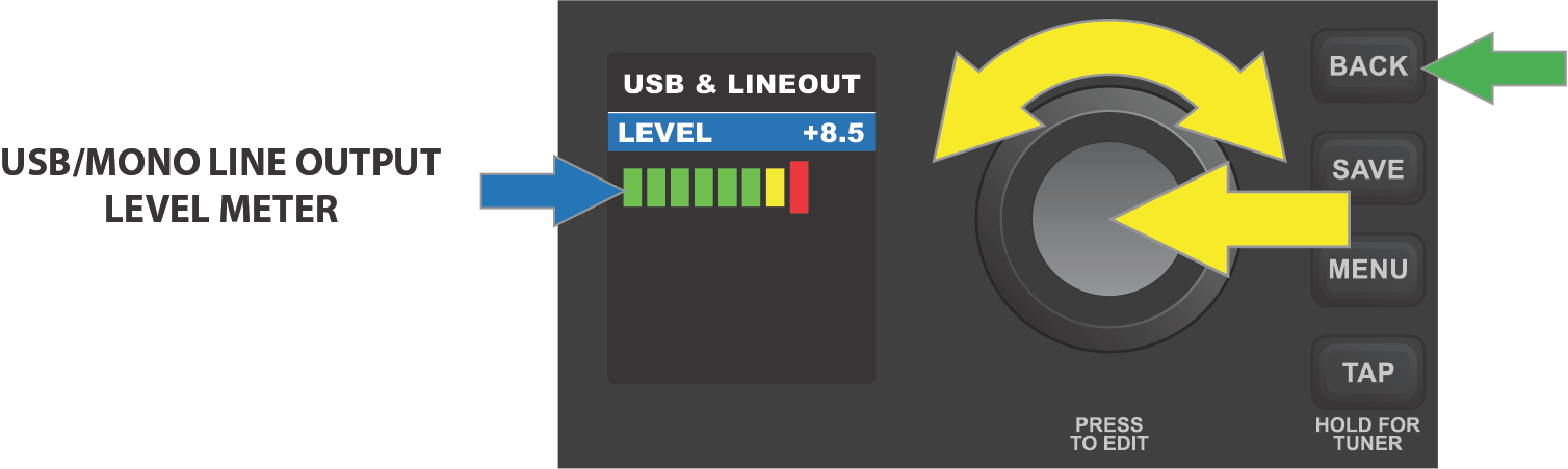 Turn the ENCODER to set a new “LEVEL” value. Press the ENCODER to accept the new value and exit the menu. Alternately, press the BACK utility button (green arrow) to accept the new value and return to the MENU function screen: