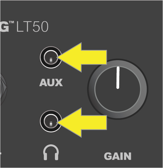 The Mustang LT50 control panel features two 1/8”-inch jacks: an auxiliary input for connecting external mobile/audio devices and an output for convenient headphone use.