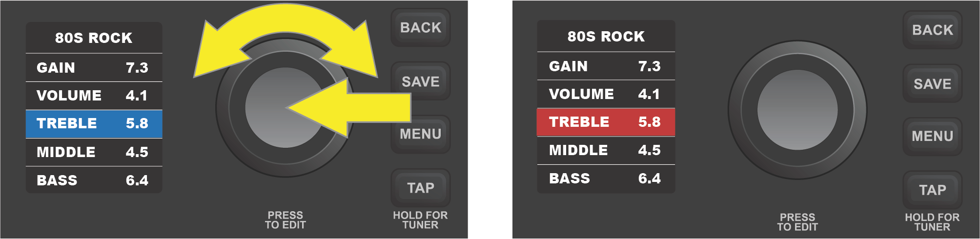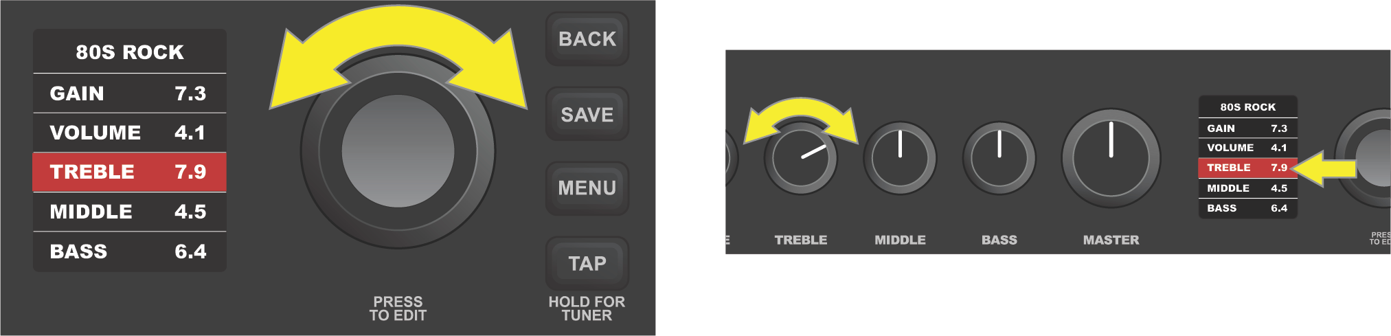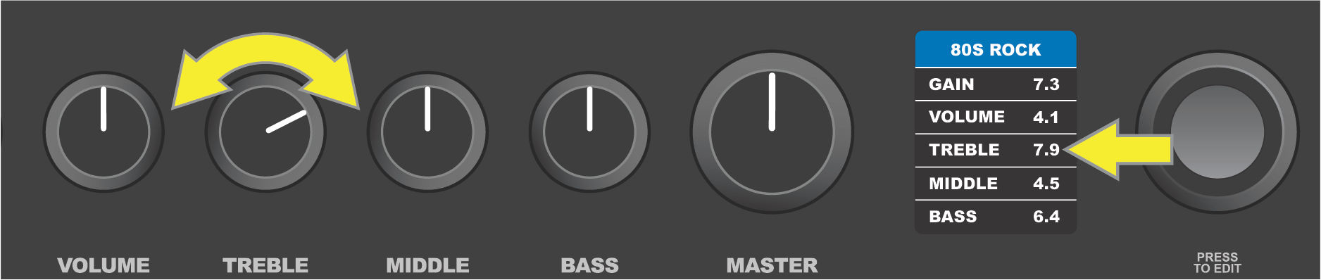 There are two ways to adjust an amp control knob setting. A control parameter that corresponds to an actual physical knob on the control panel can be adjusted simply by turning the physical control knob until the desired value is reached in the DISPLAY WINDOW. In the example below, the amp model’s TREBLE setting is adjusted by turning the physical TREBLE control knob on the control panel: