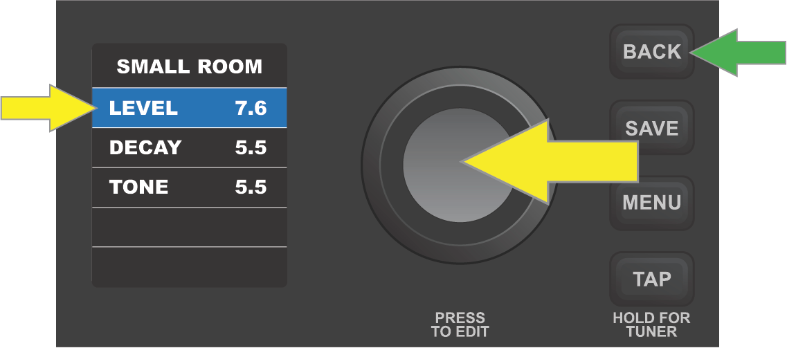 At this point, press the ENCODER or the BACK utility button (green arrow) to accept the adjusted control values. Pressing BACK returns the user to the preset contents screen; pressing the ENCODER lets the user continue making controls setting changes, and the box surrounding the control setting will return to blue. When control setting edits are complete, press the SAVE utility button to save the changes to the preset.