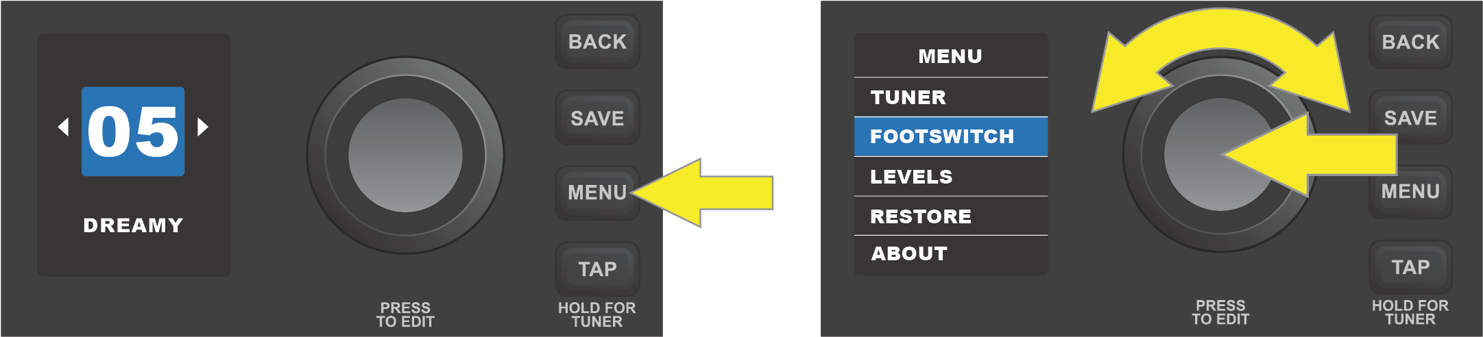 The four-button footswitch can be configured for hands-free switching among up to eight “quick-access” presets, arranged in two “banks” of four presets each. To do this press the MENU utility button and use the ENCODER to scroll to and select “FOOTSWITCH.”
