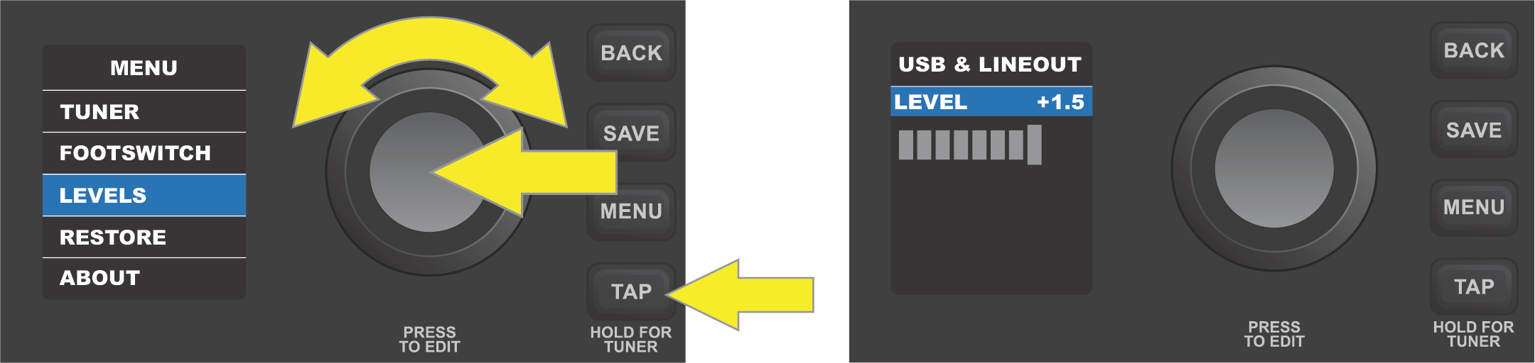 To access this option, press the MENU utility button and use the ENCODER to scroll to and select LEVELS. The level control is automatically highlighted: