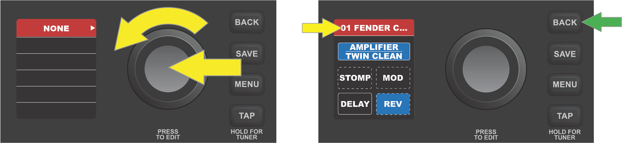 Press the ENCODER once more to activate the amplifier replacement function; the box surrounding the amp name will turn from blue to red, and white arrows will bracket the amp name. Turn the ENCODER to scroll to a new amp model. Press the ENCODER to accept the amp model change, after which the box surrounding the amp name will return to blue; or press the BACK utility button accept the amp model change and return to the preset contents screen: