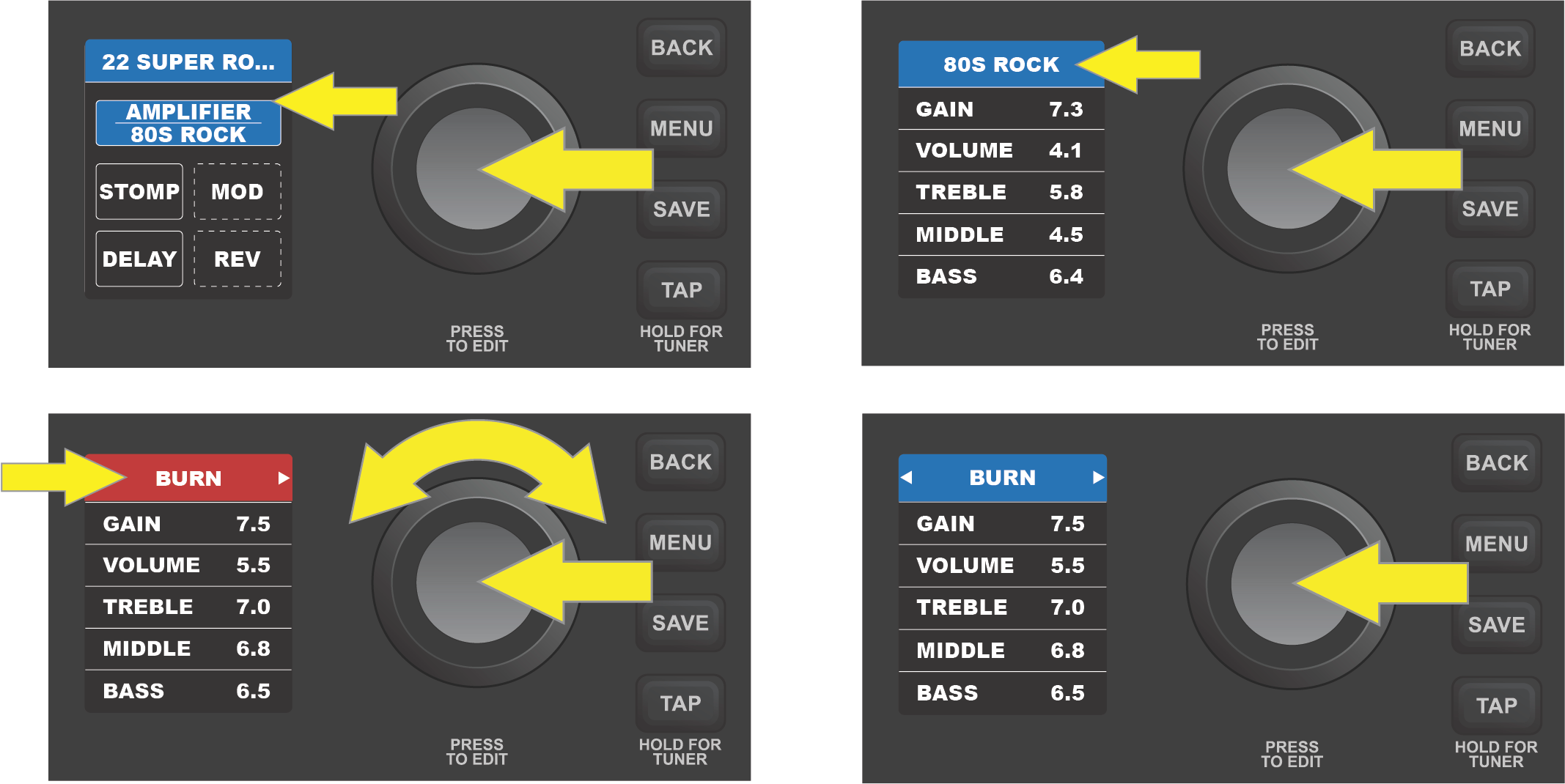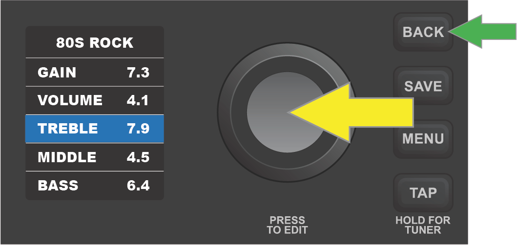To edit and save individual control settings of a preset’s amplifier model, first select the amp model by pressing the ENCODER on it. The DISPLAY WINDOW will then show a list of controls for the amp model in use: